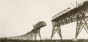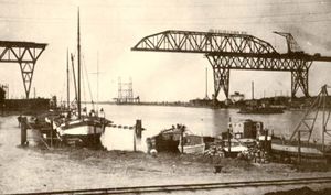Nach Fertigstellung der Stahlkonstruktionen beiderseits des Kanals wurde auf der Nordseite mit dem Bau eines Schwebeträgers – und auf der Südseite mit dem Bau eines Führungsträgers begonnen. Außerdem wurden zwei Prahme mit je 750t Tragkraft miteinander verbunden und ein Tragegerüst darauf montiert.