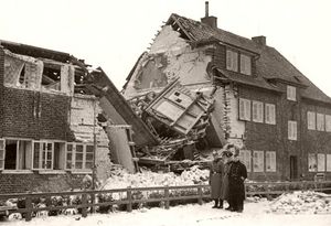 Die erste Bombe auf der Südseite Brunsbüttelkoogs zerstörte ein Zehnfamilienhaus in der Otto-Weddigen-Straße (Frischstraße – siehe Alte Straßennamen in Brunsbüttel), Ecke Westertweute.