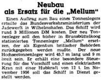 Der Tonnenleger, um den es in diesem Fall geht, die „Mellum II“, wurde 1935 von den Lübecker Flenderwerken gebaut und löste die „Mellum I“ ab. Sie wurde dem Seezeichen- und Lotsenamt Wilhelmshaven zur Verfügung gestellt. 1945 wurde sie den Briten als Reparationsleistung zugesprochen aber 1954 ist der Schritt erst vollzogen worden. Zwischenzeitlich, 1950, ist sie als erstes deutsches Schiff mit einer Radaranlage ausgerüstet worden.