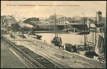 Der Barackenbau vorne links auf dem rechten Bild diente der Unterbringung der Neubauabteilung, die 1907 dem kaiserlichen Kanalamt angegliedert wurde (heute haben wir dafür Container). Später wurde dieser Anbau nicht mehr benötigt und abgerissen. Hinter dem Hafenamt ist die Kaiserhalle zu sehen. Gut erkennbar ist auch der Schienenstrang speziell für den „Kaiserzug“.