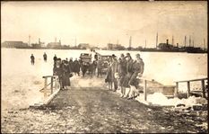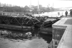 Der Brand in der Schleuse war 1939. Zu dieser Zeit waren die Torwagen noch auf den Toren fest installiert und fuhren mit. Am rechten Bildrand sieht man einen Feuerwehrmann, der diesen Torwagen kühlt.