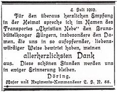 In der Kanal-Zeitung vom 6. Juni 1919 wurden die Leser um Spenden für einen liebevollen Empfang gebeten. Der Artikel hatte u.a. folgenden Text: