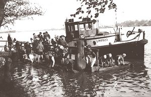 Der Bau des nächsten Anlegers, der weiter zur Fähre verlegt wurde, fand wohl etwa in den 1920er-Jahren statt. Das erste Foto (rechts) ist vom Anfang der 1950er-Jahre und zeigt recht deutlich seinen Verfall. In dieser Zeit ohne Handy und anderen elektronischen Spielzeugen war so ein Anleger ein willkommener Abenteuerspielplatz für die Jugend – und es kümmerte die Erwachsenen im Hintergrund nicht. | Der Bau des nächsten Anlegers, der weiter zur Fähre verlegt wurde, fand wohl etwa in den 1920er-Jahren statt. Das erste Foto (rechts) ist vom Anfang der 1950er-Jahre und zeigt recht deutlich seinen Verfall. In dieser Zeit ohne Handy und anderen elektronischen Spielzeugen war so ein Anleger ein willkommener Abenteuerspielplatz für die Jugend – und es kümmerte die Erwachsenen im Hintergrund nicht. | ||