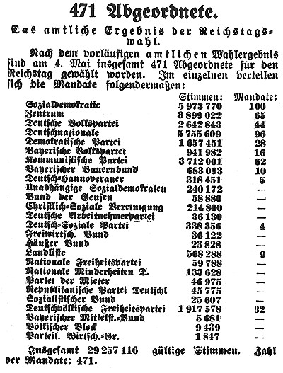 - (Herunterladen) 1924-05-05 581a Ergebnisse Reichstagswahlen.jpg . . 800 × 506 . . 132 KB . . Wolfgang Dugnus . . 20:33, 25. Jan. 2022