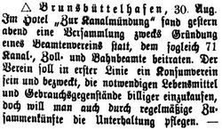 Im Jahre 1895 fand im Hotel zur Kanalmündung eine Versammlung zwecks Gründung eines Beamtenvereins statt, der in erster Linie ein Konsumverein sein sollte. Über diese Vereinigung existiert leider nur ein Artikel aus der Kanal-Zeitung 1895.