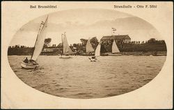 Zwei Jahre später, 1906, faßte man den Entschluß, am Deich eine Halle zu errichten, und erhielt der Badeverein für diese Halle eine Teilkonzession. Die erste Strandhalle, ein kleiner, schuppenähnlicher Holzbau, stand unter dem Deiche an der Steinböschung auf hohen Pfählen, um bei Hochwasser nicht gefährdet zu werden. Sie wurde eines Nachts vom Herbststurm über den Deich geweht und man fand sie am anderen Morgen in den Pütten zersplittert vor. Das Anlagekapital für den Bau der neuen Strandhalle wurde zur ersten Hälfte von der Brunsbütteler Sparkasse gegeben, für den Rest bürgten die Mitglieder der derzeitigen Strandhallenkommission mit Beiträgen von 300,- M. bis 1000,- M.