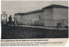 1929 konnte der Badeverein weitere kleine Verbesserungen durchführen. In den Toiletten der Strandhalle wurden Waschbecken angebracht, 7 weitere Ruhebänke vom Verkehrsverein fanden Aufstellung und 6 weitere Badekabinen wurden beschafft. Vor allem erfolgte in diesem Jahre die Aufstellung des Damen- und Herrenbades an der Deichkrone. Bisher hatten sie an der Steinböschung gestanden, und sie mußten, oft unter großen Schwierigkeiten und persönlichen Strapazen der Vorstandsmitglieder auf den Deich gebracht werden. Nicht immer war das rechtzeitig möglich, und oft schwammen die Kabinen bereits in der Elbe und wurden von den Wellen zerschlagen. Auch der häufige Hin- und Hertransport brachte Beschädigungen an den Kabinen mit sich. Jetzt blieben die Badekabinen, die in geschlossener Front aufgestellt und mit einem Laufsteg versehen waren, auch im Winter am Deich stehen. Das bisherige Herrenbad wurde jetzt Familienbad. Vor den Veranstaltungen dieses Sommers sei ein Wettschwimmen unter Beteiligung des Itzehoer Schwimmvereins erwähnt. 1930 wurden bei beiden Bädern Flaggenmasten errichtet, an denen täglich vom Beginn bis zum Ende der Badezeit die Jakobus-Flagge gehißt wurde. Inzwischen hatte der Fremdenverkehr so zugenommen, daß die Strandhalle, besonders an Sonn- und Feiertagen, die Gäste nicht annähernd zu fassen vermochte. Der Vorstand faßte daher den Plan, die Strandhalle durch einen Erweiterungsbau au vergrößern. Er ließ eine Bauskizze für den Erweiterungsbau anfertigen und holte Kostenanschläge für den Umbau ein. Die Ausführung dieses Planes scheiterte aber an der Unmöglichkeit, die benötigten Gelder zu beschaffen. Die Deichfläche vor der Strandhalle wurde durch Betonplatten befestigt.