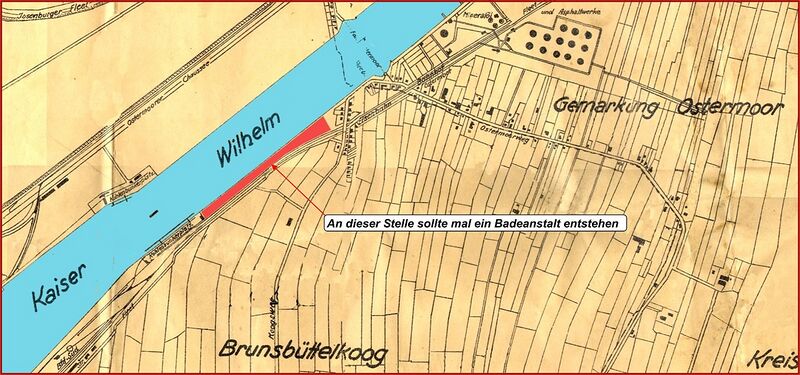 Der Plan zeigt ein Gebiet (rot eingefärbt) zwischen der KiKaKo in Brunsbüttelkoog und der Fähre Ostermoor, das man zur Verfügung stellen würde. In einer Sitzung des BBS wurde eine Kommission aus Dr. Schiewe, Zimmermeister Kruse und Schmiedemeister Johann Todt gebildet, die sich dieser Angelegenheit widmen sollten.