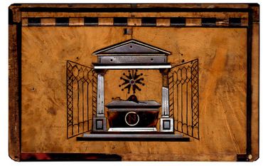 In gleicher, feiner Intarsienarbeit, z.T. durch Perlmutt hervorgehoben, wird auf der Rückseite das Grabmal (Trombeau) mit dem Sarkophag Napoleons des I. im Invalidendom zu Paris gezeigt - und über allem „schwebt“ die Trikolore.