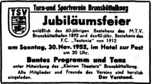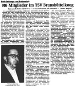 Der Artikel rechts aus der Brunsbüttelkooger Zeitung deutet auf das 60-jährige Jubiläum des MTV und gleichzeitig das 40-jährige Jubiläum des S.V. Teutonia, der später in den TSV überging.