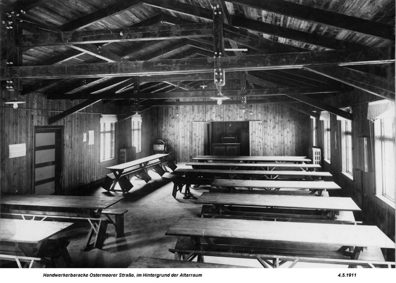 Datei:235-Handwerkerbaracke,Speisesaal mit Altarraum-4.5.1911.JPG