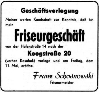 Der Friseur Franz Schosnowski hatte anfangs (1947) einen Laden in der Brunsbütteler Str. 16, dann in der Hafenstraße 14, ging 1956 in die Koogstraße 20 um dann letztendlich- 1966 - Schlesier Platz 11 einen Laden zu eröffnen. Im gleichen Jahr übernahm seine Tochter Ilse das Geschäft,1968 übergab sie es an Jürgen Franck.