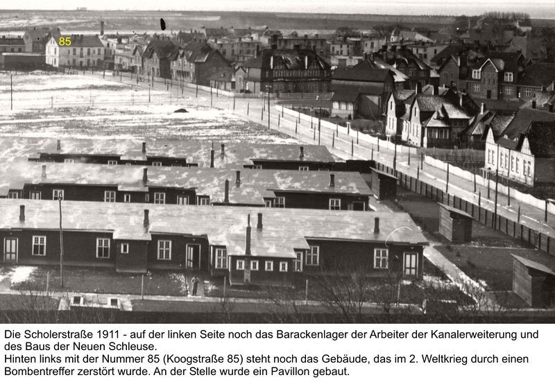 Auf älteren Aufnahmen ist zu erkennen, das das Gebäude Koogstraße 85 nicht von Anfang an ein Pavillon war. Dieser entstand erst nach dem Krieg, nachdem diese Fläche durch einen „Bombentreffer frei wurde“ (18.06.1944).