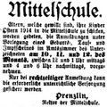 Interessante Einzelheiten über die ersten Schuljahre, über die Lehrkräfte, die Stundentafel, benutzte Schulbücher, über die Zusammensetzung der Schülerschaft u. a. m. sind in einem Jahresbericht der „Knaben- und Mädchenmittelschule i. E." für das Schuljahr 1912/13 von ihrem damaligen Rektor Prenzlin festgehalten. Daraus ein paar Zeilen: